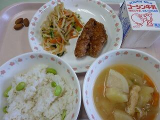 牛乳 たけのこごはん めばるのから揚げレモン塩 キャベツの胡麻和え 大根の味噌汁 いり大豆