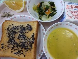 セサミトースト 黒ゴマ かぼちゃのポタージュ わかめサラダ葱ドレッシング