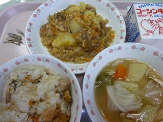 山菜おこわ じゃが芋のそぼろ煮 きゃべつのみそ汁 小魚 牛乳