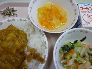 和風ポークカレーライス ごまドレッシングサラダ フルーツ和え いり大豆 牛乳