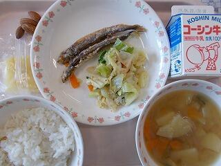 子持ちししゃもの唐揚げ 野菜の磯香合え 肉じゃが タロッコ(みかんの仲間) いりカシューナッツ ごはん 牛乳