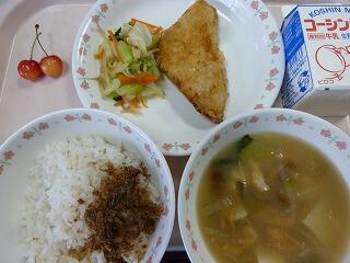 ごはん ふりかけ 赤魚(めぬけ)のから揚げレモン塩 野菜の辛し和え なめこ汁 さくらんぼ 牛乳