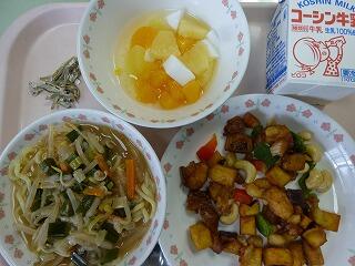 味噌ラーメン カシューナッツの揚げ煮 杏仁豆腐 小魚 牛乳