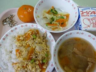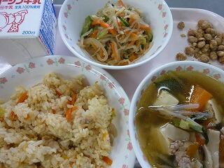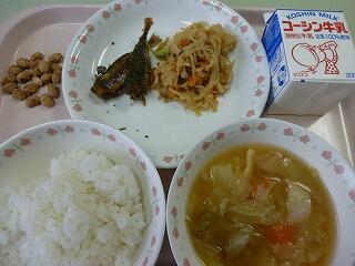 ごはん 小あじのかりかり揚げ 切干大根の旨煮 キャベツのみそ汁 黒糖大豆 牛乳