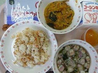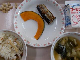ごぼうごはん 秋刀魚のトウバンジャン焼き やきかぼちゃ 豆腐とわかめのみそ汁 いり大豆 牛乳