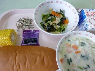コッペパン ブルーベリージャム かぶのシチュー(チーズ入り) 海藻サラダ とうもろこし 子魚 牛乳