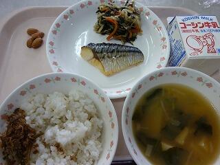 ごはん ふりかけ 鯖の文化干し 野菜の磯香和え じゃがバターのみそ汁 いりアーモンド 牛乳