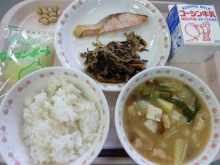 ごはん 焼き塩鮭 ひじきのいり煮 なめこ汁 冷凍洋梨 いり大豆 牛乳
