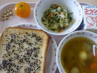 セサミトースト黒ゴマ ポトフ(カレー味うずらの卵入り) すき昆布サラダ 冷凍みかん いり大豆 牛乳