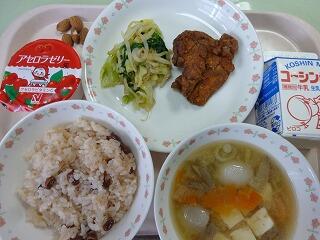 赤飯 とりの唐揚げ 辛子和え みそけんちん汁 アセロラゼリー いりアーモンド 牛乳