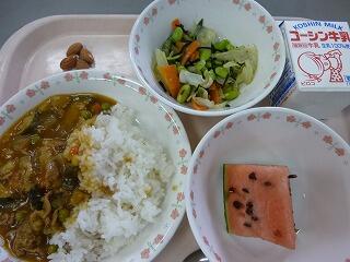 夏野菜ポークカレーライス ひじきと枝豆のサラダ スイカ いりアーモンド 牛乳