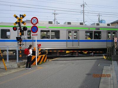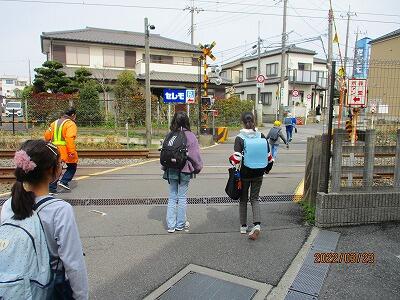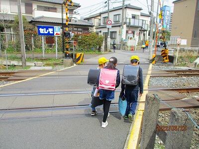 渡る子ども達,踏切を通過してくる子ども達,毎日十分気をつけてくださいね。