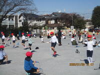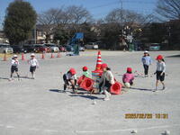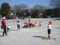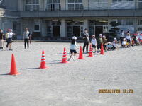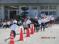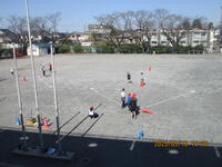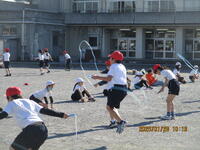 1年生が、校庭で体育の授業を行っています。投げる能力を高める運動を、ゲームの形式で行っていました。ルールは、玉入れの球をコーンの中に入れると1点で、やわらかいドッジボールで真ん中のカラーコーンを倒すと30点です。子どもたちは、夢中になってボール投げに取り組んでいました。さわやかな天気の中で、みんな楽しく活動できました。