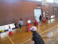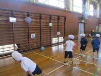 体育館で、1年生が投げる力を高める運動に取り組んでいました。体育館を6つのブースに分け、ドッジボールや玉入れの球を動物が描いてある的に当てるブースやボールを当ててコーンを倒すブースなど、児童が楽しみながら投げる力を伸ばす活動を行いました。近年、児童の体力低下がニュースにもなっていますが、特に投げる力が下がってきています。これからも、児童が楽しみながら、体力を向上できるよう工夫していきたいと思います。