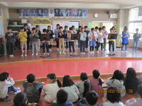 今日は、1年生と4年生のミニ音楽発表会を行いました。1年生は「とんくるりん ぱんくるりん」、4年生は「赤いやねのいえ」「スーパーカリフラジリスティックエクスピアドーシャス」の発表を行いました。発表後は、お互いの学年の良かったところを発表し合っていて、とてもすばらしい発表会になりました。