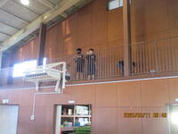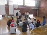 昼休みに、体育委員会主催の長縄教室が、体育館で行われています。体育委員会の児童が、縄を回してあげて、児童が8の字で跳ぶ練習をしています。また、別の場所では、ダブルダッチを練習している児童もいました。1年生から6年生までが一緒になって、楽しく活動する様子が見られました。