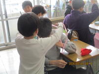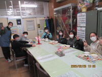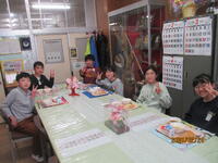 明日は、節分です。2年生が鬼のお面作りをしていました。赤や青、緑色など、個性豊かな、かわいらしいお面が完成しました。また、隣のクラスでは、昔遊びを体験していました。けん玉やこま回しなど、上手にできるようになってきました。