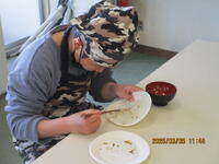 今日は、ひまわり学級が餃子づくりを行いました。1つ1つ丁寧にぎょうざの餡を皮で包み、きれいな餃子を作りました。最後は、フライパンで焼きます。羽根つきで少し焼き目のついた、おいしそうな餃子が完成しました。みんな手際よく準備し、安全に気をつけて調理していたので感心しました。試食させていただきましたが、生姜やニンニクの風味が感じられ、お店で売っている餃子よりもおいしかったです!ごちそうさまでした。