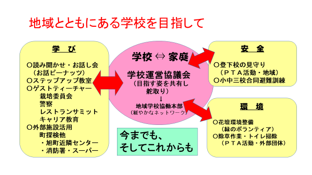 学校と地域が力を合わせ、互いに信頼し合い、子供たちの成長を支え、地域とともにある学校づくり、地域コミュニティづくりを進めていくことがねらいです。