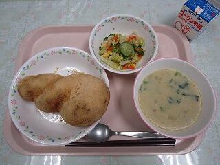 牛乳、きなこ揚げパン、レンズ豆のポタージュ、コーンサラダ