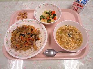 牛乳、焼肉丼、かぶのカリポリ和え、たまごとはるさめのスープ、メープルカシューナッツ