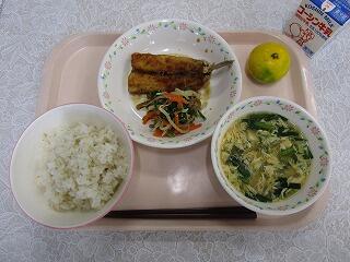 牛乳、ご飯、いわしのかば焼き、ごまみそ和え、にらたま汁、みかん