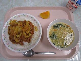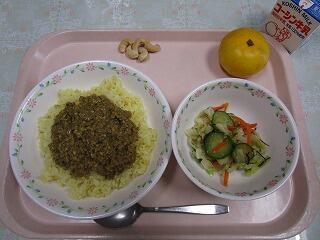 牛乳、ドライカレー、塩こんぶサラダ、みかん、カシューナッツ