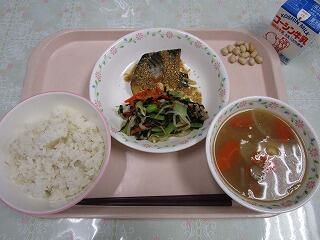 牛乳、ごはん、さばのごまみそ煮、のり和え、いも団子汁、いり大豆