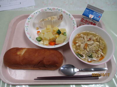 牛乳・さつまいもパン・タラのつぶマスタード焼き・マセドアンサラダ・たまごと野菜のスープ