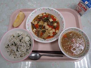 牛乳、わかめごはん、肉どうふ、すいとん汁、りんご