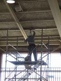 体育館の電球のなかに「球切れ」していて、つかないものがありました。本日、体育館アリーナに「ローリングタワー」を設置し、業者の方がLED電球に交換をしてくれました。おかげさまで、すべての電球がつくようになり、明るくなりました。
