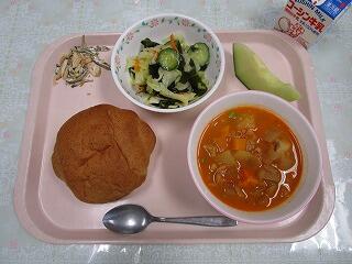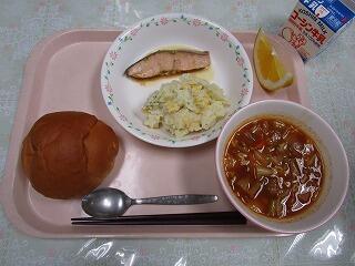 牛乳、ロールパン、鮭のバター焼き、コーンポテト、ミネストローネ、みしょうかん