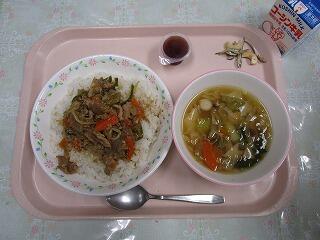 牛乳、ホイコーロー丼、ワンタンスープ、ナタデココ入りフルーツ和え、大豆小魚
