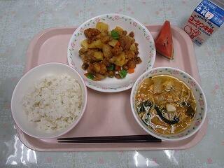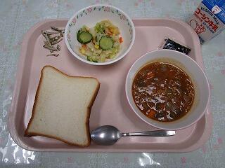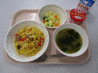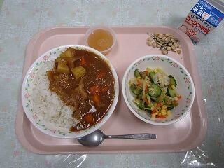 牛乳、チキンカレーライス、りっちゃんの元気サラダ、ピーチゼリー、大豆小魚