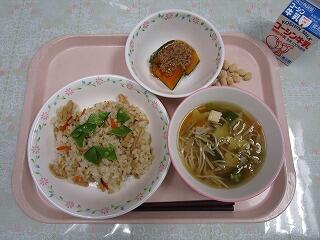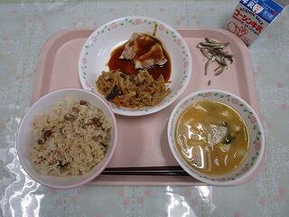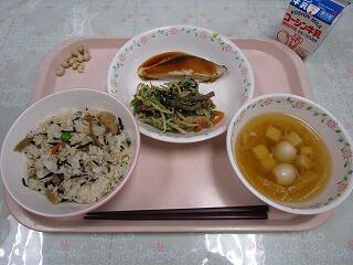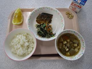 牛乳、さつまいもごはん、いなだの照り焼き、おひたし、えのき茸のみそ汁