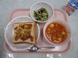 牛乳、ツナチーズトースト、とり肉と大豆のトマト煮、ひじきのサラダ