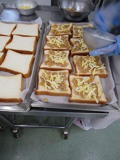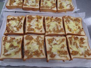 食パンにツナ、コーン、玉ねぎを炒めて調味した具をのせているところです。