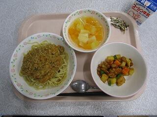 今日は、フランスの料理「ラタトゥイユ」をスパゲティにかけてみました。夏野菜たっぷりのラタトゥイユで、フランス気分を味わってみてください。デザートは抹茶味のスコーンです。中にチョコチップを混ぜ込んでみました。おいしくできあがりました