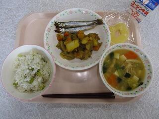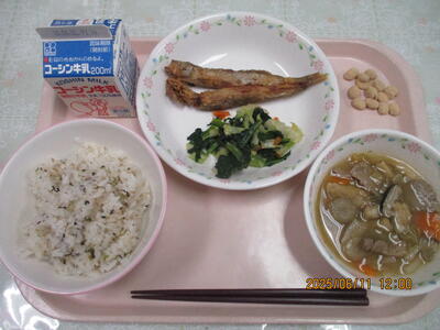 牛乳・なめし・子持ちししゃものからあげ・おひたし・ごぼうの味噌汁・きなこ大豆