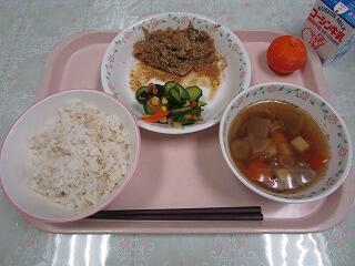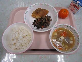 牛乳、ごはん、さばのごまみそ煮、コーンとわかめの和え物、けんちん汁、冷凍みかん