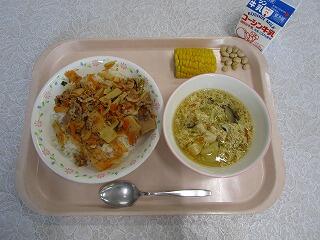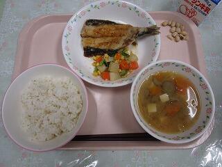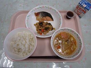 牛乳、ごはん、さけのバターしょうゆ焼き、切干大根のうま煮、玉ねぎとわかめのみそ汁、いり大豆