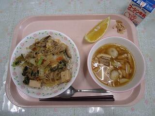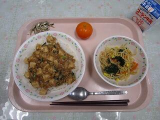 今日は中華です。麻婆豆腐の中には、豚のひき肉や、細かく切った具材がたっぷり入っていますので、栄養満点です。給食の麻婆豆腐は、あまり辛くない味つけで食べやすくしていますが、本場の中国の麻婆豆腐はとても辛いです。今日はごはんの上にかけて食べましょう。