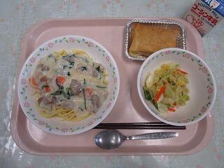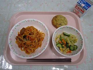 牛乳、ラタトゥイユスパゲティ、コーンサラダ、抹茶チョコスコーン