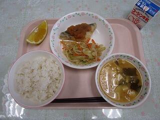 牛乳、ご飯、鱈と野菜の揚げ煮、ごま仕立てのみそ汁、メロン
