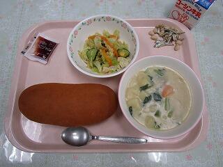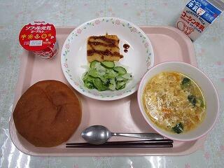 牛乳、まるパン、チキンカツ、グリーンサラダ、たまごとポテトのスープ、大豆小魚