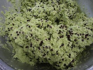 材料を混ぜて、蒸しパンの生地ができあがりました。ダイスチーズも中に入っています。