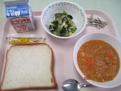 牛乳、食パン、チョコスプレッド、チリコンカン、コーンサラダ、小魚