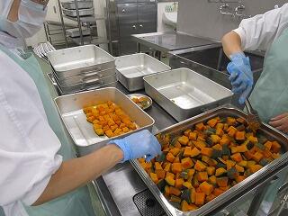 蒸し上がったかぼちゃを数えながら食缶に入れています。