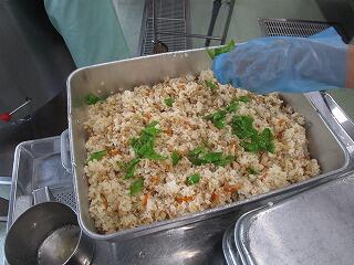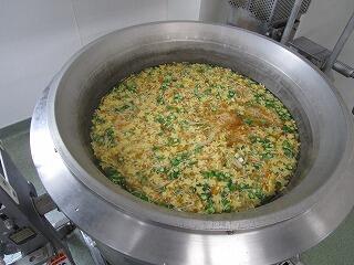 ご飯と具を大釜で混ぜ合わせて、給食室特製のパエリアが完成しました。