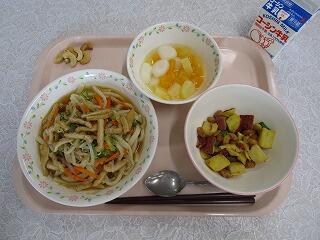 牛乳、やきそば、春野菜の煮物、チーズ入り蒸しパン